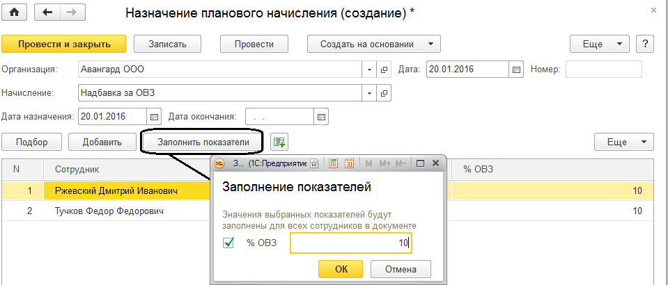 Далее в документе заполняется список сотрудников, для которых задается размер показателей начисления. Значение показателя можно установить всем сотрудникам одновременно.
