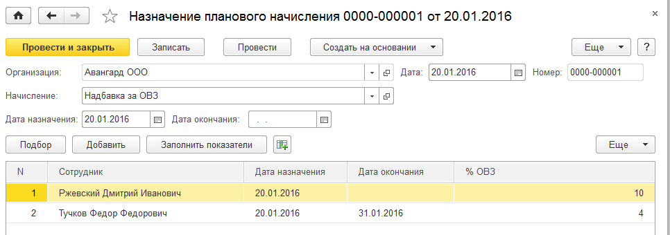 2. С 28.01.2016 сотрудники ООО "Авангард" Ржевский Д.И. и Тучков Ф.Ф. получили дополнительные задания руководства, за которые на период их выполнения им назначена надбавка за ОВЗ. Зарегистрируем документ "Назначение планового начисления" на новую дату и укажем процент надбавки 7% и периоды выполнения заданий: