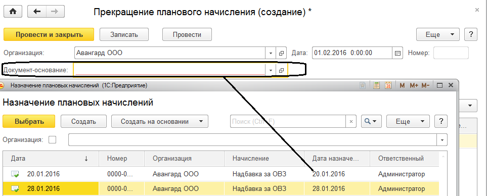 С 01.02.16 сотруднику ООО "Авангард" Ржевскому Д.И. прекращена надбавка за ОВЗ за первое задание (назначенная в размере 10%). Откроем раздел "Зарплата / Изменения оплаты труда" и добавим документ "Прекращение планового начисления" на 01.02.2016. Выберем соответствующий документ из списка документов-назначений.
