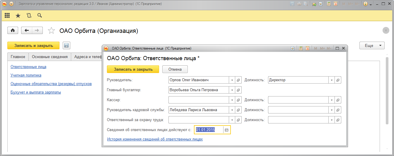 Необходимо заполнить сведения об ответственных лицах, которые будут фигурировать в качестве подписантов документов.