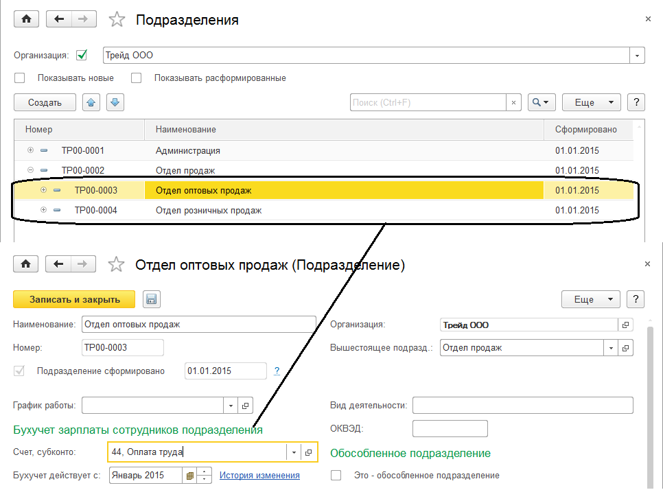Откроем в разделе «Настройка / Подразделения» справочник подразделений организаций. Откроем список подразделений ООО «Трейд». Выполним настройку способов отражения в учете с января 2015г.: для отдела оптовых продаж и отдела розничных продаж – на 44йсчет.