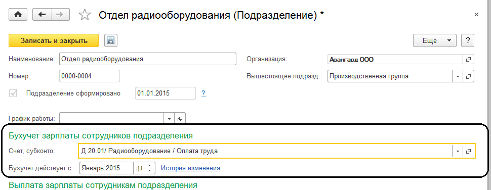 В карточке подразделения также возможно указать способ отражения зарплаты сотрудников данного подразделения в учете.
