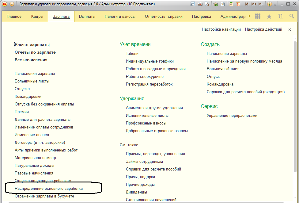 Для ввода сведений о распределении заработка сотрудников в учете используется документ "Распределение основного заработка". Доступ к документу осуществляется в разделе "Зарплата".