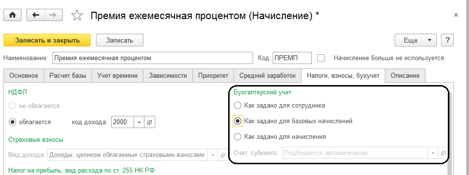 Для некоторых начислений целесообразно настроить собственные способы отражения в учете непосредственно в настройках начисления (закладка "Налоговый и бухгалтерский учет").