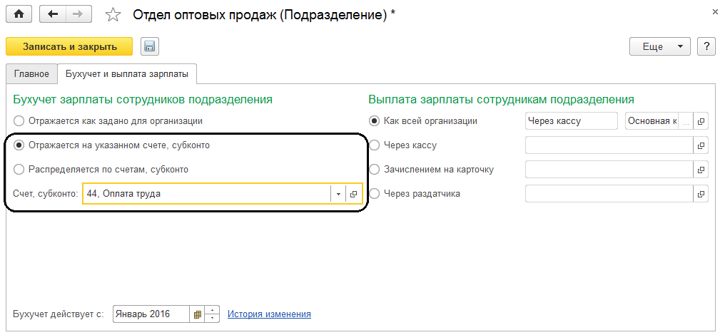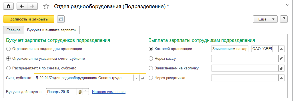 В карточке подразделения также возможно указать способ отражения зарплаты сотрудников данного подразделения в учете.