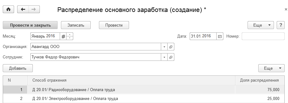 В табличной части документа выбираются способы отражения в учете и доля распределения. Общая сумма долей должна равняться 100%. Этот способ более приоритетен, чем настройки карточки сотрудника.