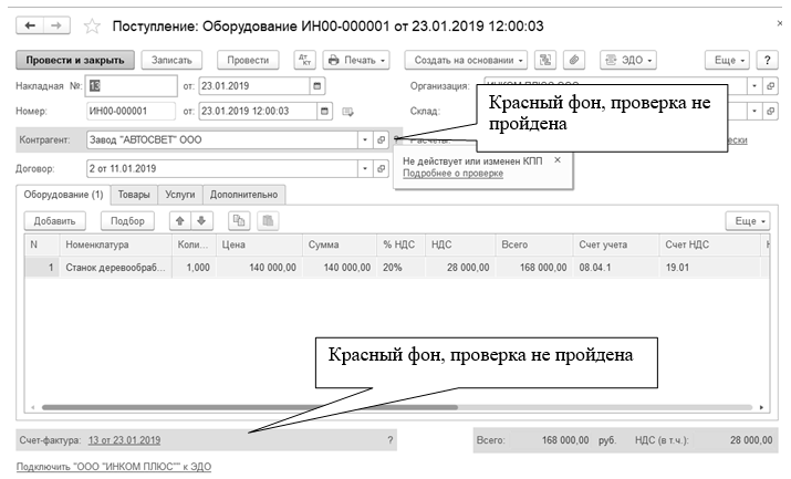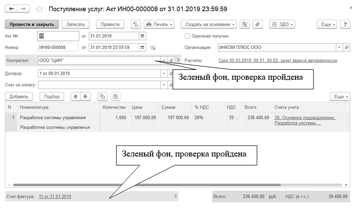В зависимости от результатов проверки контрагент и счет-фактура в документах выделяются красным фоном, если проверка не пройдена (рис. 20.4), или зеленым фоном, если проверка пройдена (рис. 20.5).