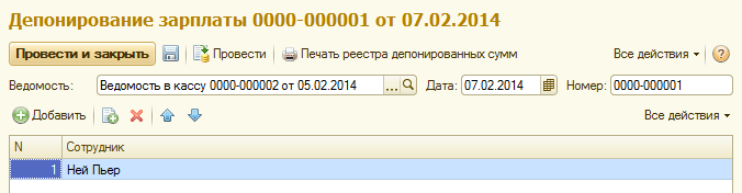 Создадим документ "Депонирование" на основании ведомости на выплату  зарплаты через кассу для П.Нея: в течение трех дней сотрудник не получил зарплату за месяц, дата документа-депонирования 07.02.2014, сотрудник выбирается в документе вручную.