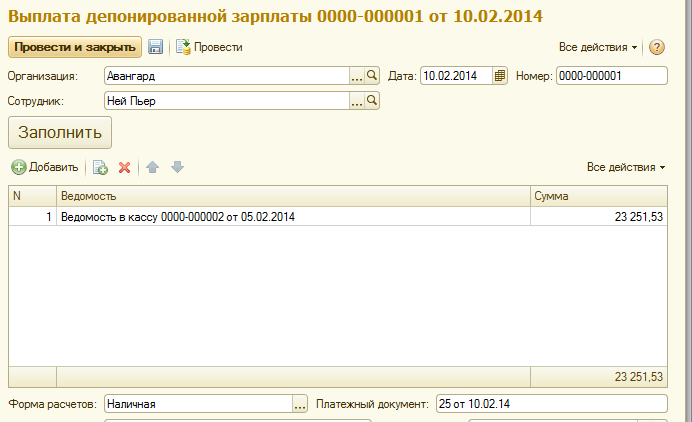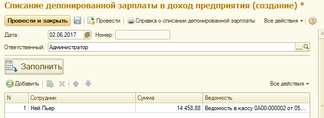 По команде "Заполнить" можно заполнить документ всеми задепонированными суммами этому сотруднику по всем ведомостям.