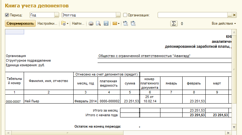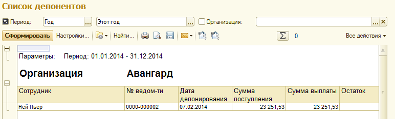 • Список депонентов – позволяет оценить остаток депонированных сумм на конец периода в отчете по сотрудникам.