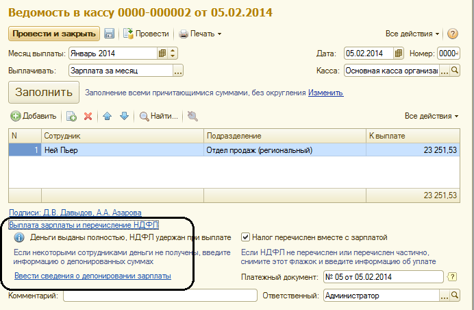 Если кто-то из сотрудников не получил зарплату в установленные сроки, то на основании ведомости на выплату в кассу /через раздатчика можно ввести документ "Депонирование".