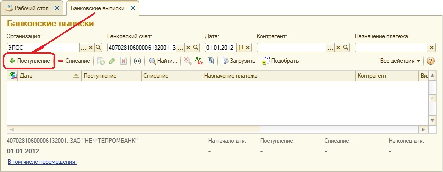 – сведения об организации – получателе (ЗАО ЭПОС) и банковском счете, на который зачислена сумма (ЗАО «Нефтепромбанк» (расчетный)) подставляются в форму автоматически (если этого по каким-то причинам не произошло, поля следует заполнить сведениями соответственно из справочника Организации и Банковские счета);