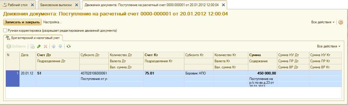 1. Ввести в информационную базу документы «Поступление на расчетный счет» на зачисление денежных средств, поступивших от учредителей НПО «Боровик» и КБ «Топ-Инвест» и провести их.