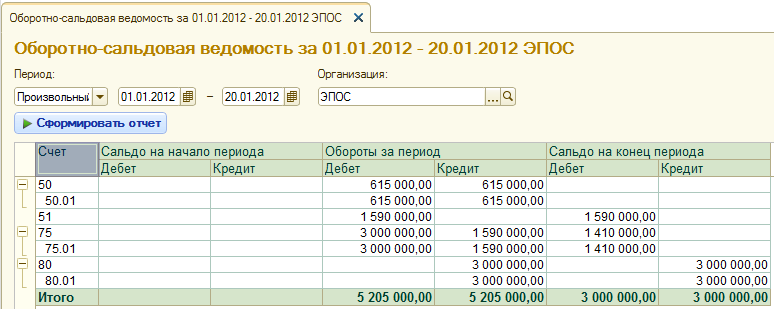 Контрольную цифру проверяем также с помощью оборотно-сальдовой ведомости по счету 51, сальдо дебетовое на конец периода с 01.01.2012 по 20.01.2012 должно составлять 1 590 000.00 руб. (рис. 6-9).