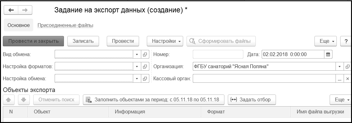 Задание на экспорт" предназначен для формирования списка выгружаемых объектов и последующей работы со списком, а также для формирования и отправки файлов.