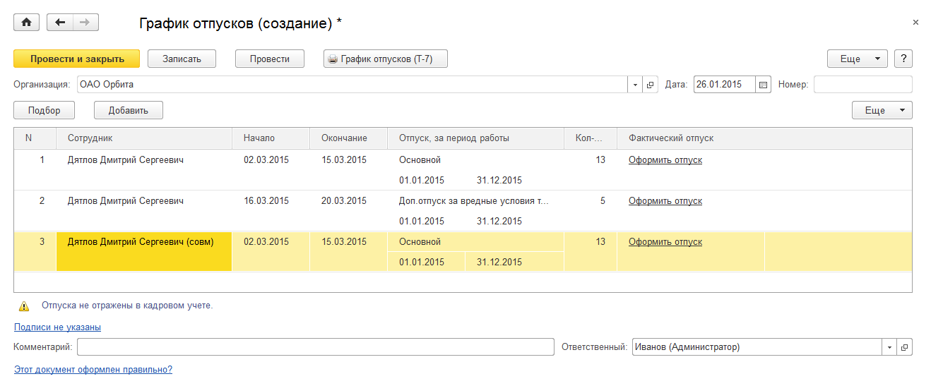 По ссылке Этот документ оформлен правильно? можно проверить соответствие запланированных отпусков правам сотрудников на отпуск согласно учету остатков отпусков.