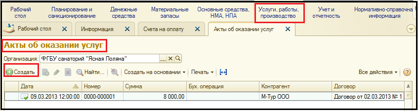 Для ввода нового документа можно нажать на кнопку Создать командной панели списка Акты об оказании услуг.