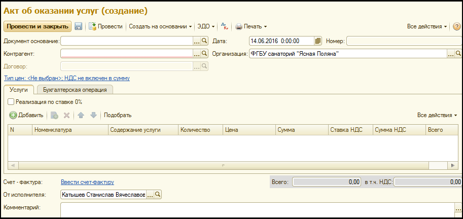 Документ основание – указывается документ, на основании которого введен Акт об оказании услуг.