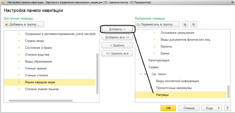 Установив курсор на справочник "Награды" нажмем команду "Добавить", справочник будет перенесен в правую часть в раздел "См. также".
