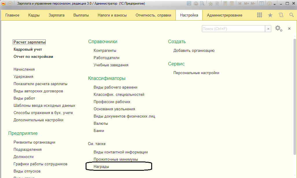 Требуется добавить в навигацию данного раздела кадровый справочник "Награды". Для этого нажмем команду "Настройка - Настройка навигации" и найдем в левой части указанный объект.