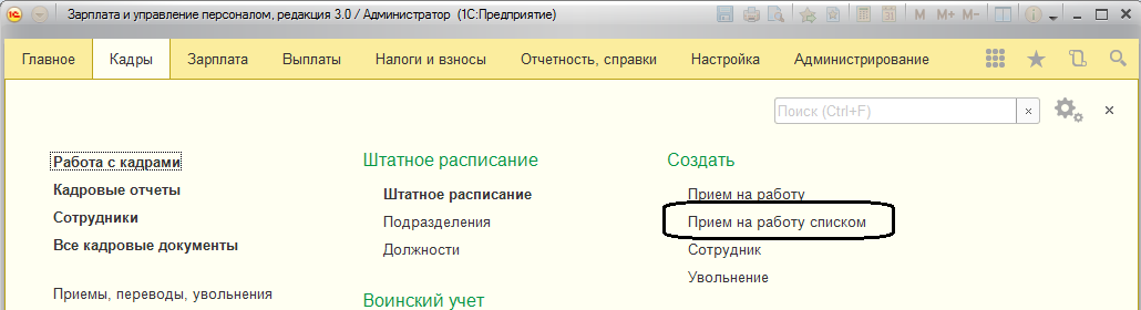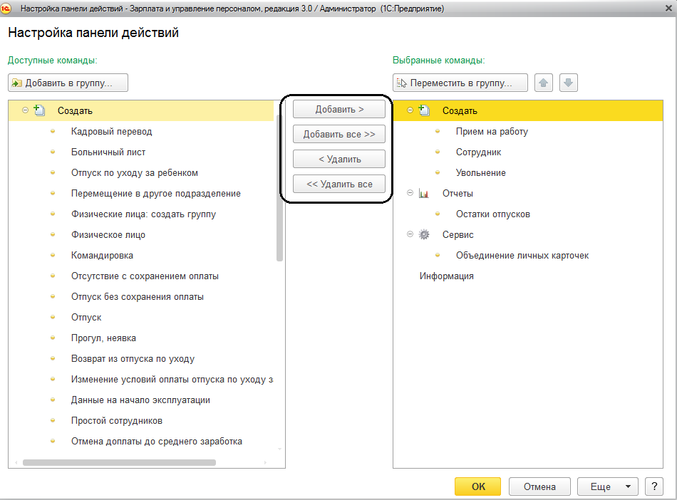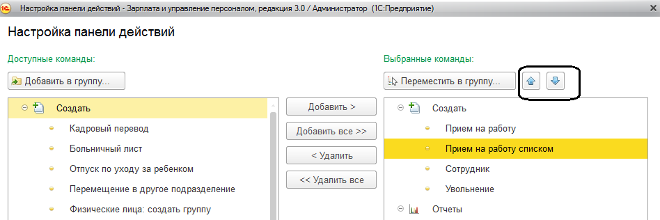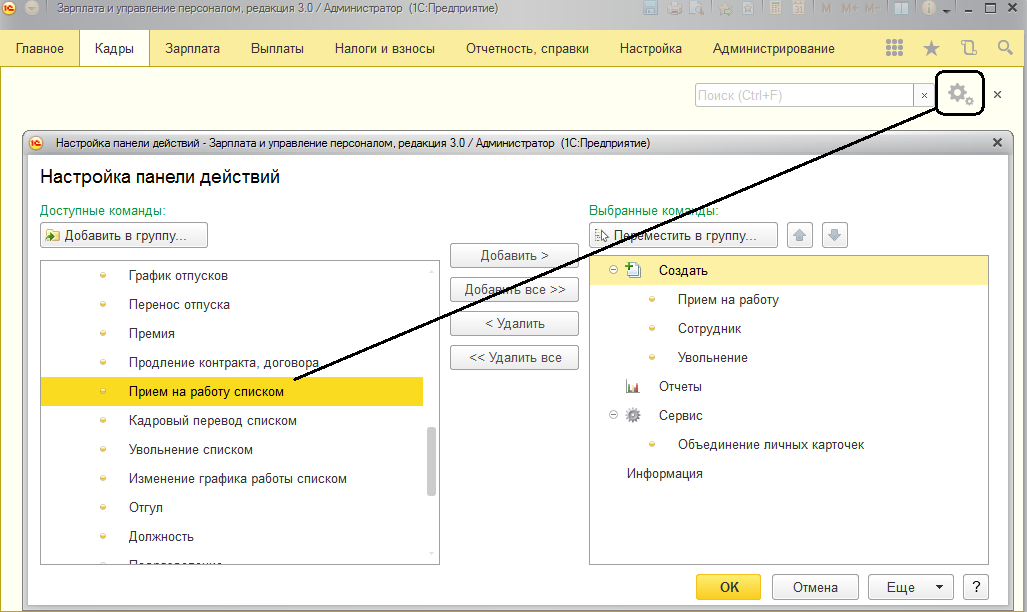 2. Перейдем в раздел "Кадры". Требуется добавить на панель действий команду создания приказа о приеме на работу списком. Для этого выберем команду "Настройка - Настройка действий", в левой части в блоке "Создать" найдем приказ о приеме на работу списком и добавим его в правую часть по команде "Добавить".