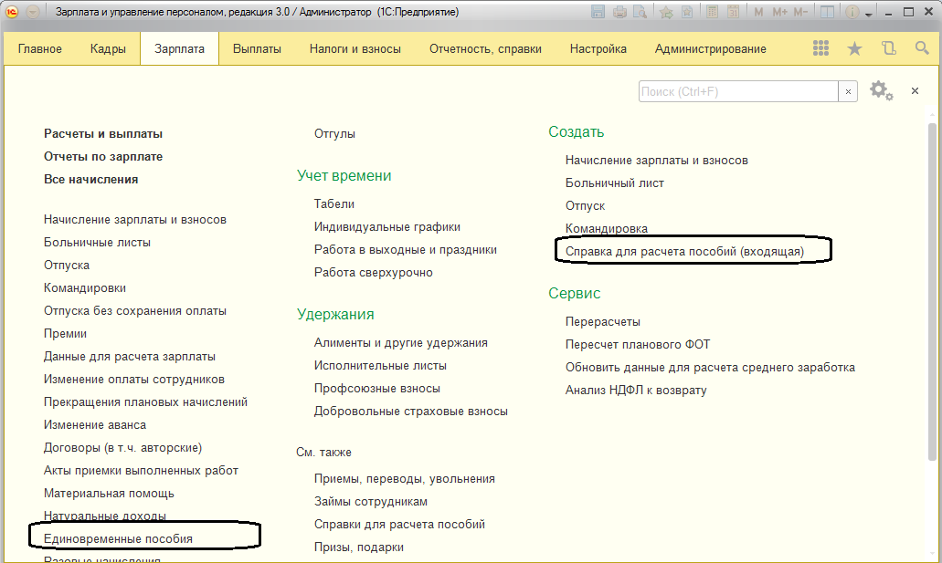 3. Перейдем в раздел "Зарплата". Аналогичным образом настроим отображение на панели навигации документа "Единовременное пособие", а на панель действий – команду создания справки для расчета пособий (входящей).