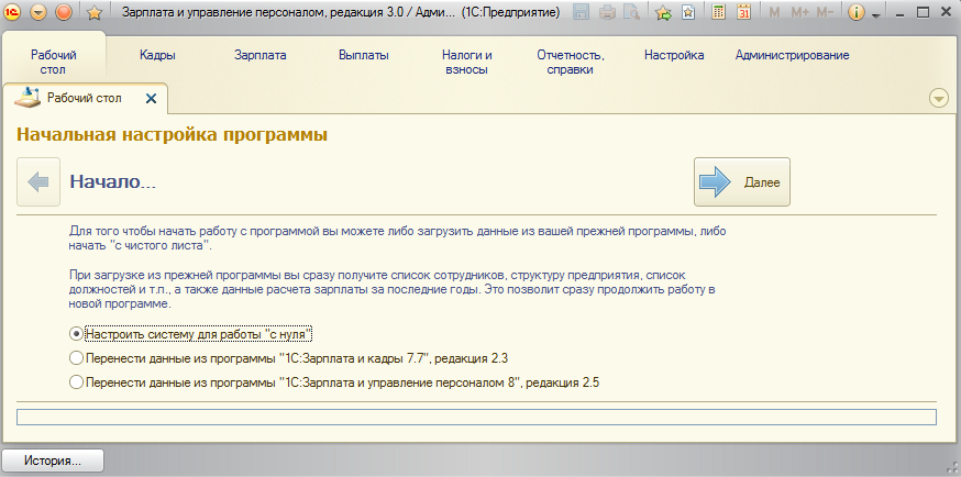 Начальная страница при первом запуске программы представляет собой стартовый помощник. При последующих запусках здесь будет отображаться один из инструментов работы, в зависимости от основной роли пользователя – кадровик, расчетчик.
