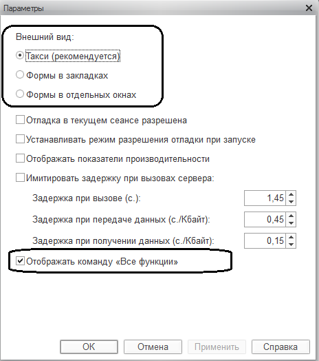 В рамках курса используется режим "Такси" (в Приложении 5 можно просмотреть настройку внешнего вида в режиме управляемых форм - "Формы в закладках").