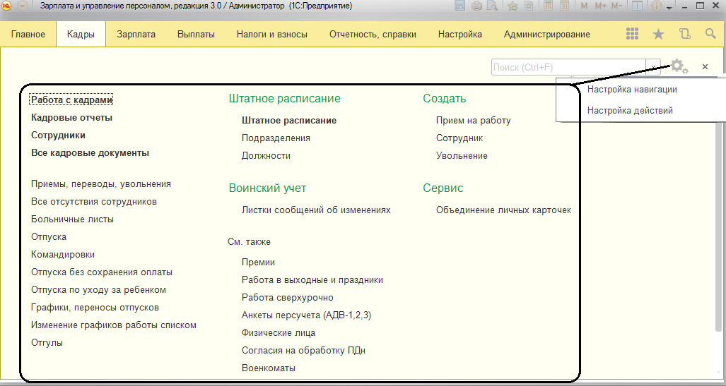 - Кадры: в данном разделе доступны кадровые справочники (штатное расписание, физические лица, сотрудники), кадровые документы (приемы, переводы и т.п.), документы по отсутствиям сотрудников, кадровые отчеты, документы и отчеты по воинскому учету.
