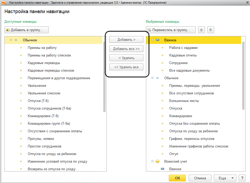 Панель навигации пользователь также может настраивать отдельно для каждого раздела по команде "Настройка навигации": добавлять команды в раздел "Важное" (выделяется жирным цветом), обычное, и дополнительные данные (См. также).