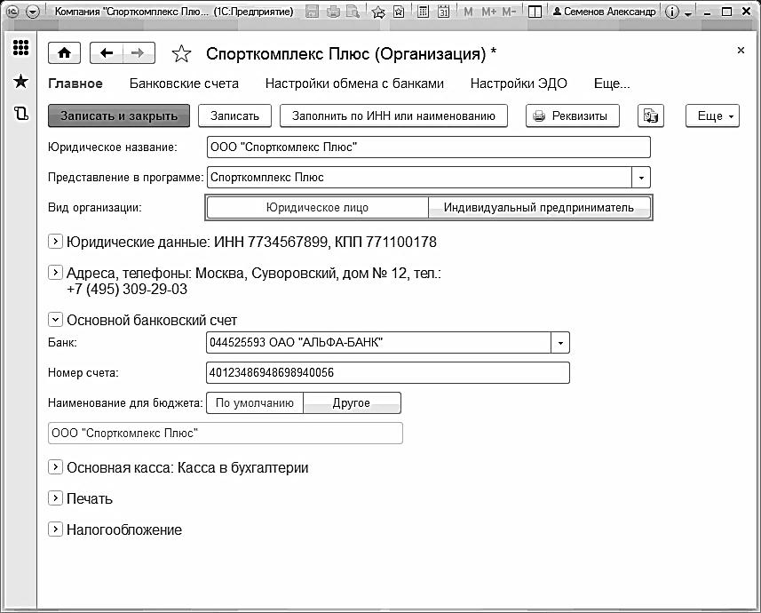 Сократить время на ввод данных об организации можно, если ввести ее название или ИНН в соответствующее поле и нажать на кнопку "Заполнить по ИНН или наименованию" в верхней части карточки.