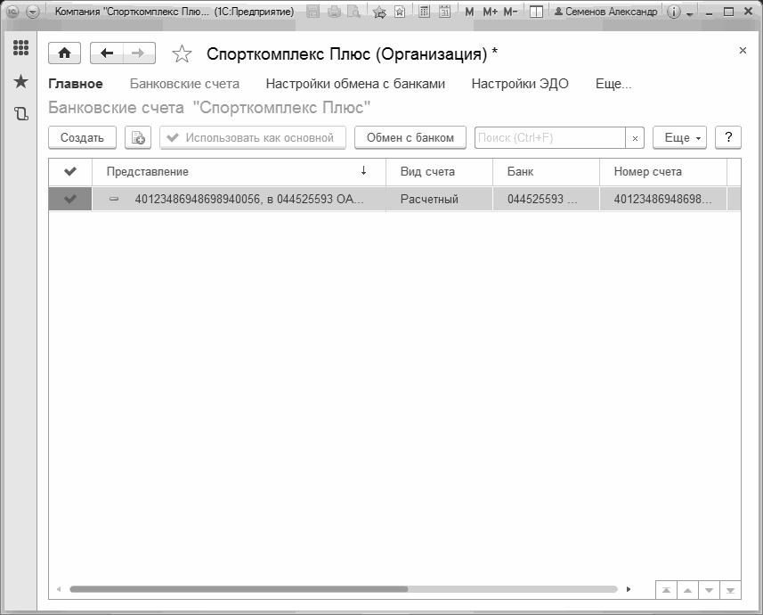 Также следует заполнить реквизиты компании (группа "Юридические данные"), адреса и телефоны соответствующей информацией. Основной расчетный счет организации можно ввести в группе "Основной банковский счет" (Рис. 14). Если счетов несколько, то для добавления остальных надо перейти по ссылке "Банковские счета" в верхней части карточки организации (Рис. 15). В карточке расчетного счета надо обязательно заполнить поля "Банк" и "Номер счета".