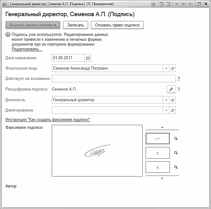 В группе "Налогообложение" настраивается система налогообложения организации и устанавливается процент налога. Отдельно стоит отметить настройку логотипа, факсимильной печати и подписи компании. В группе "Печать" необходимо добавить картинки логотипа и печати в специальные формы (рекомендуется прочитать краткую инструкцию "Как создать факсимиле печати" по ссылке выше"). В полях "Подпись руководителя" и "Подпись главного бухгалтера" следует выбрать элемент справочника "Подписи". Как выглядит настройка подписи руководителя можно увидеть на Рис. 16.