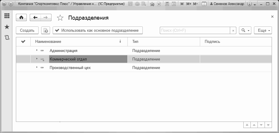Подразделением в программе считается организационно-штатная единица, в разрезе которой ведется учет доходов и расходов. Необязательно количество подразделений должно совпадать со штатным расписанием организации. Например, в штатном расписании может присутствовать один отдел продаж, а в УНФ – оптовый отдел продаж и отдел продаж интернет-магазина. Подразделения можно создать в разделе "Компания" по одноименной ссылке. У нового элемента справочника должен быть в поле "Тип" установлено значение "Подразделение".