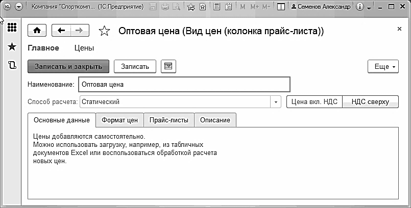 Теперь обратимся непосредственно к настройке форме прайс-листа. См. Рис. 38. Справочник "Прайс-листы" доступен в разделе "Продажи" в группе "Цены" панели навигации.