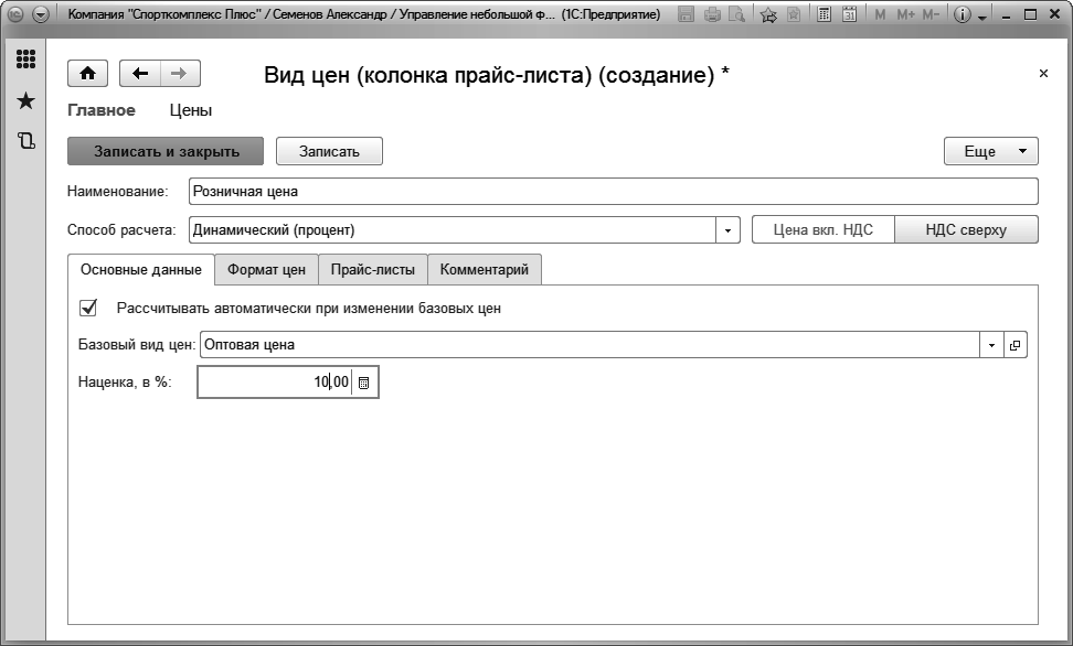 - Динамический (процент). При динамическом способе расчета с процентом определяется базовый вид цен и процент наценки/скидки. Цены будут автоматически пересчитываться при изменении базового вида цен.