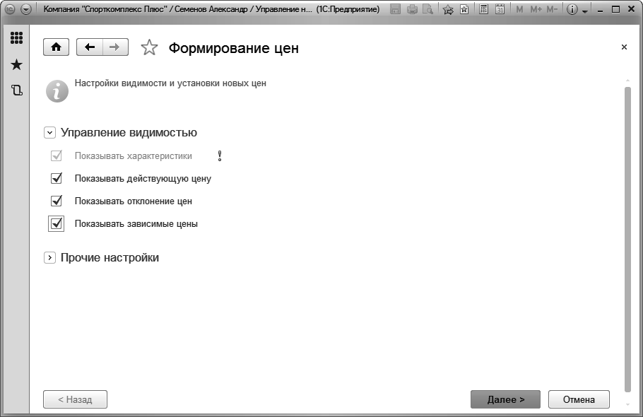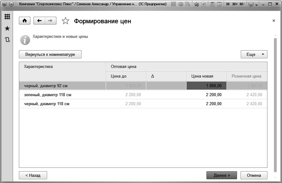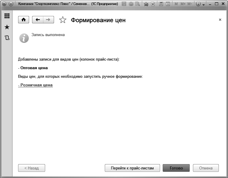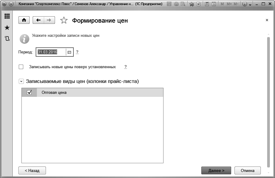 Цены номенклатуры не обязательно всегда вводить вручную для каждой номенклатурной позиции, во многих случаях их возможно рассчитать на основании какой-либо уже имеющейся в программе информации. Например, розничные и оптовые цены могут быть рассчитаны на основании закупочных, а закупочные могут быть установлены на основании приходной накладной поставщика. Могут быть и другие примеры расчетов. Во всех подобных случаях целесообразно пользоваться специальной обработкой программы, которая называется "Формирование цен" и доступна на панели навигации раздела "Продажи. На Рис. 33 – Рис. 37 показан пример использования механизма "Формирования цен", в котором для всех позиций группы "Спортивный инвентарь" устанавливаются новые оптовые цены, на их основании рассчитываются розничные.