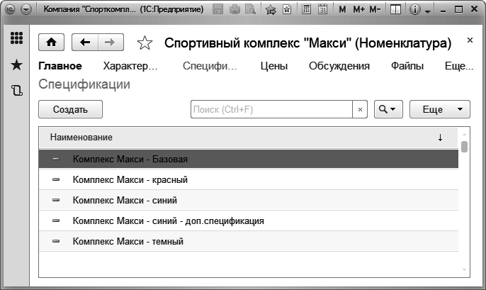 Какие материалы (сырье) используются при выпуске продукции, и какие технологические операции при этом выполняются, определяет спецификация. Спецификаций может быть несколько для одной и той же единицы продукции. Но, как правило, одна из них является основной, ее и можно указать в карточке номенклатуры в группе "Закупка и производство". Перечень всех спецификаций номенклатурной позиции можно увидеть, нажав на ссылку "Спецификации" в верхней части карточки номенклатуры. См. Рис. 41 и Рис. 42.