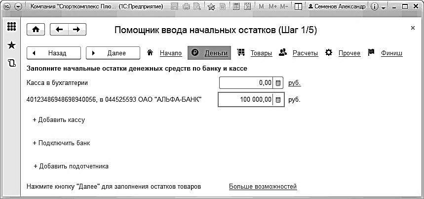 Рис. 50. Ввод начальных остатков по денежным средствам