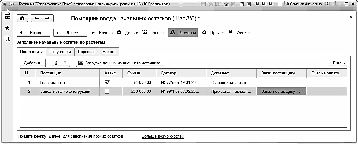 . Вводятся остатки по взаиморасчетам в разрезе контрагентов, договоров, заказов поставщикам. Если поставщик нам должен, то ставится флажок "Аванс". Если мы должны ему, то флажок не ставится. Данные по остаткам расчетов с поставщиками могут быть загружены из электронной таблицы.
