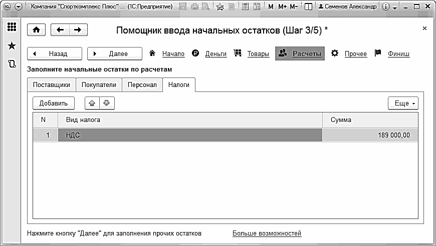 ). На вкладке "Налоги" осуществляется ввод остатков взаиморасчетов по налогам в разрезе видов. Сумма выплаченного, но не начисленного налога вводится со знаком минус.