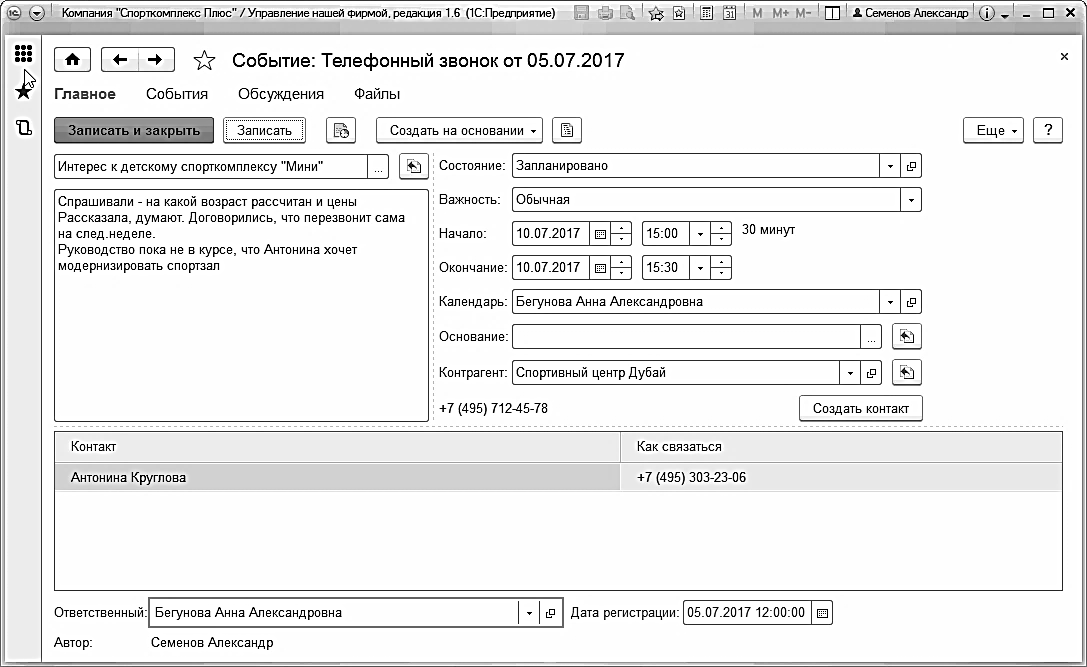 - Реквизиты "Начало:" и "Окончание:" определяют то, когда данное событие происходит. В частности, для события с состоянием "Запланировано" именно в этих реквизитах (а не в дате документе) нужно указывать планируемую дату события.