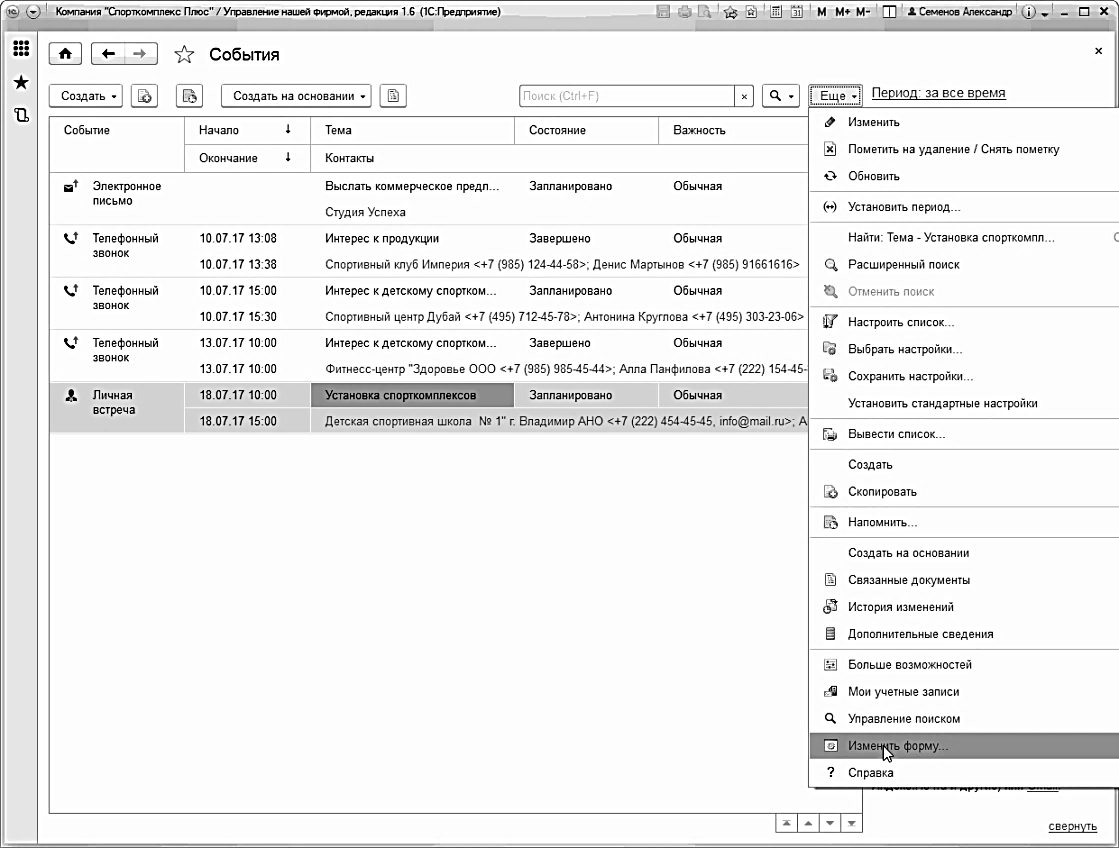 Внешний вид списка событий по клиентам (как и любой список документов в программе) можно видоизменять по своему усмотрению, исходя из текущих задач или удобства работы. Такую возможность нам предоставляет платформа "1С:Предприятие 8.3". Для изменения формы списка документов предназначена кнопка "Еще" (Рис. 59), далее необходимо выбрать "Изменить форму".