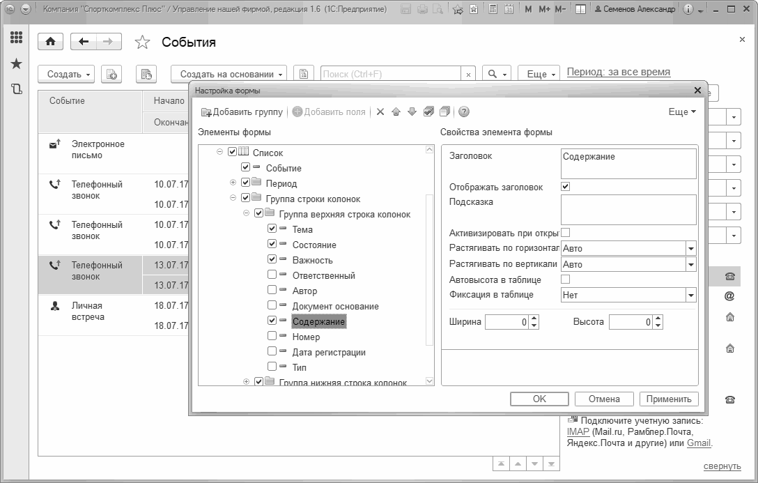 Рис. 61. В форму списка событий добавлен реквизит "Содержание"