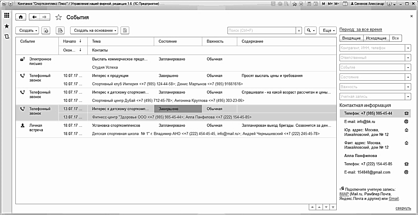 В программе "1С:Управление нашей фирмой 8" предусмотрена возможность регистрации контактов с клиентами. При этом можно регистрировать как уже состоявшиеся контакты (звонки, встречи, переговоры, переписку), так и планируемые события контакты. Регистрация производится с помощью документа "Событие" (Рис. 57). Доступ к документам "Событие" осуществляется в разделе "CRM".