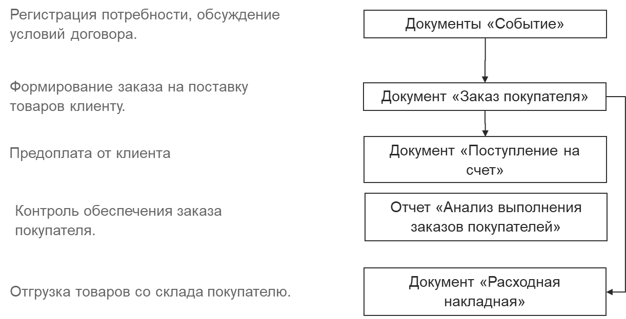Обратимся к схеме, которая наглядно показывает документы и отчеты, участвующие в процессе реализации товаров покупателям.
