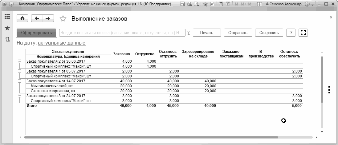 После проведения документа "Заказ покупателя", товары на складе резервируются под данный заказ, что мы сможем увидеть в отчете "Анализ выполнения заказов покупателей" (Рис. 98).