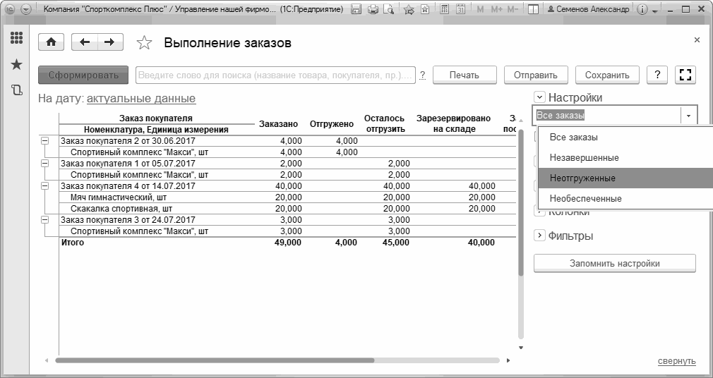 А еще удобнее включить в отчет только невыполненные заказы. Для этого надо установить в настройках отчета отбор таким образом, чтобы отчет показывал только те заказы, по которым есть неотгруженный товар. Установка такого отбора показана на Рис. 99.