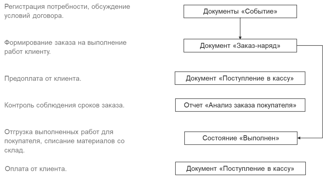 В этом разделе мы узнаем, как отражать в программе выполнение работ. А сначала давайте посмотрим на схему с документами и отчетами, которые будем использовать.