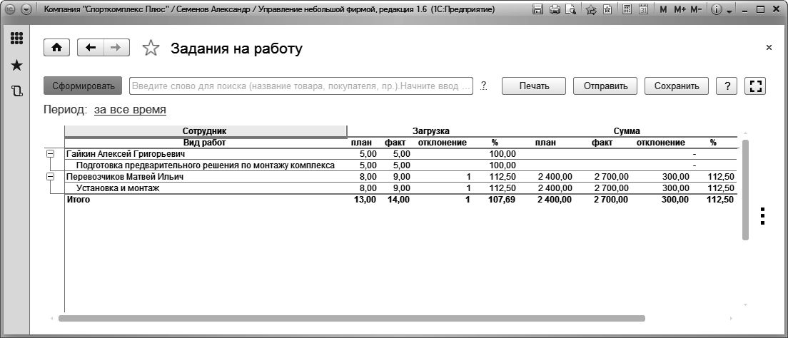 Для контроля и анализа планируемого и затраченного времени на выполнение работ предназначен отчет "Задания на работу", доступный в разделе "Работы". В примере, показанном на Рис. 109, сотрудник Перевозчиков потратил 9 часов на установку и монтаж вместо запланированных 8 часов. Подобные ситуации должны быть предметом регулярного анализа. Тем более что данная работа является оплачиваемой заказчиком (в отчете присутствуют суммы, помимо количества), а значит – мы недополучили, возможно, от заказчика сумму, равную стоимости одного часа работы. Если это действительно так (сотрудник отработал больший объем работ, и заказчик принял его), то заказчику надо бы оформить дополнительный заказ-наряд на 1 час работ и выставить счет. Хотя в можно поступить и проще – внести изменение в существующий заказ-наряд, благо он еще не закрыт.